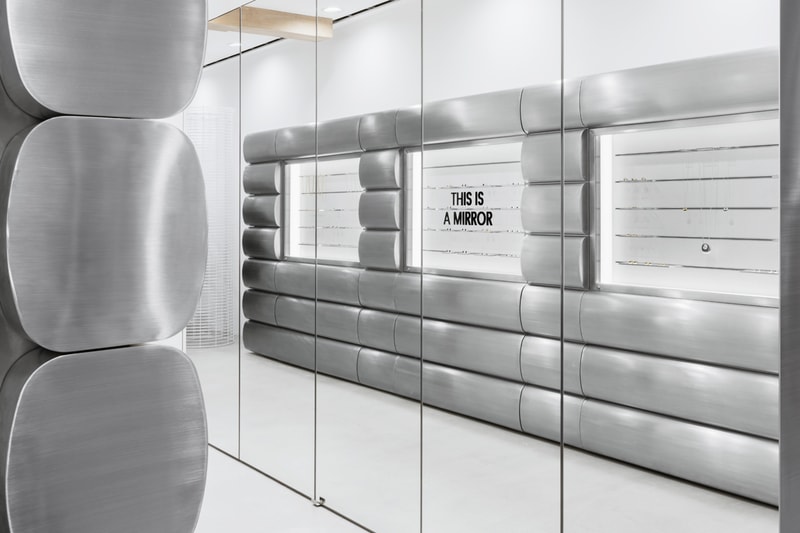 Sleek materials also provide contrast to the contemporary jewelry pieces, which are displayed in three windows, each containing five glass shelves. Adding light to the space are floor-to-ceiling vertical mirrors.