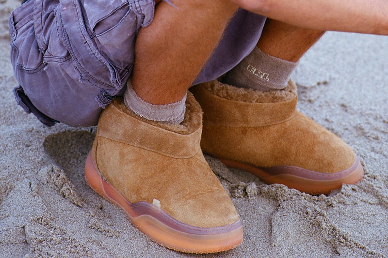 Underneath the minimalist suede exterior, a semi-transparent gum sole provides a subtle, branded element by revealing the ERL logo. Linnetz’s attention to detail extends to the packaging: the boots arrive in boxes made from the same corrugated material used by the US Postal Service, transparently showing the interior wrapping printed with archival images from 1970s Venice Beach underground newspapers.