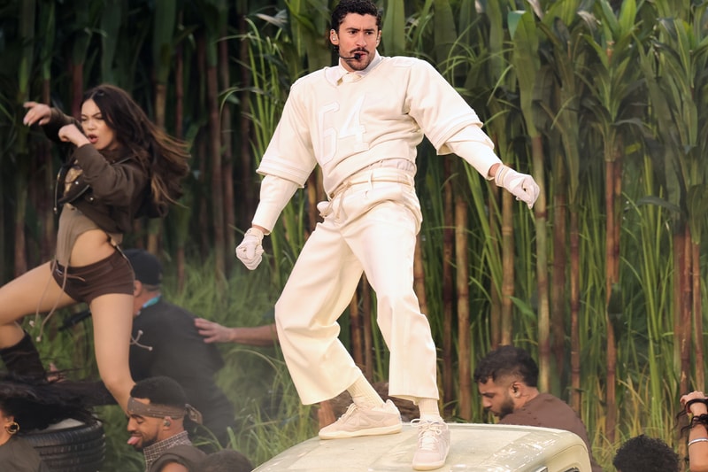 Bad Bunny wore a custom all-white ensemble designed by Zara for his Super Bowl LX Halftime Show performance